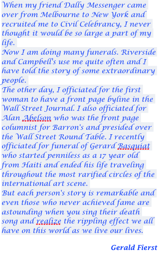 The funeral celebrant is a professional listener. We emphasise the importance of being a respectful, “professional listener.” Listening skills are essential to crafting deeply personal and meaningful ceremonies.